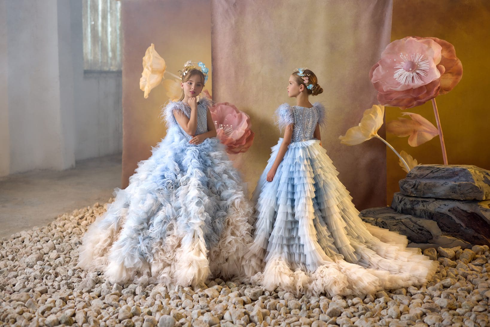 The Blue Mist Feathered Ball Gown is a breathtaking creation perfect for girls’ special occasions. This luxury dress features a cascading waterfall of layered tulle in soft blue and white hues, accented with delicate feathered shoulders. The bodice is intricately embellished, adding a touch of sparkle to the ethereal design. Ideal for making a grand entrance, this gown blends whimsical charm with sophisticated elegance, ensuring your little one stands out at any event.