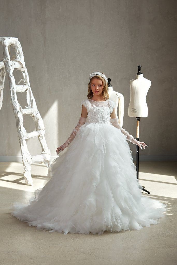 Introducing Girls First Holy Communion Dress – Célestine, a symphony of elegance and luxury. This long white dress features a puffy tulle volant skirt and enchanting crystal flower decorations, adding an opulent touch. Célestine is perfect for the First Holy Communion ceremony, embodying sophistication and style. Elevate your event with this enchanting masterpiece that epitomizes haute couture charm, ensuring your young one radiates grace and opulence in every step.
