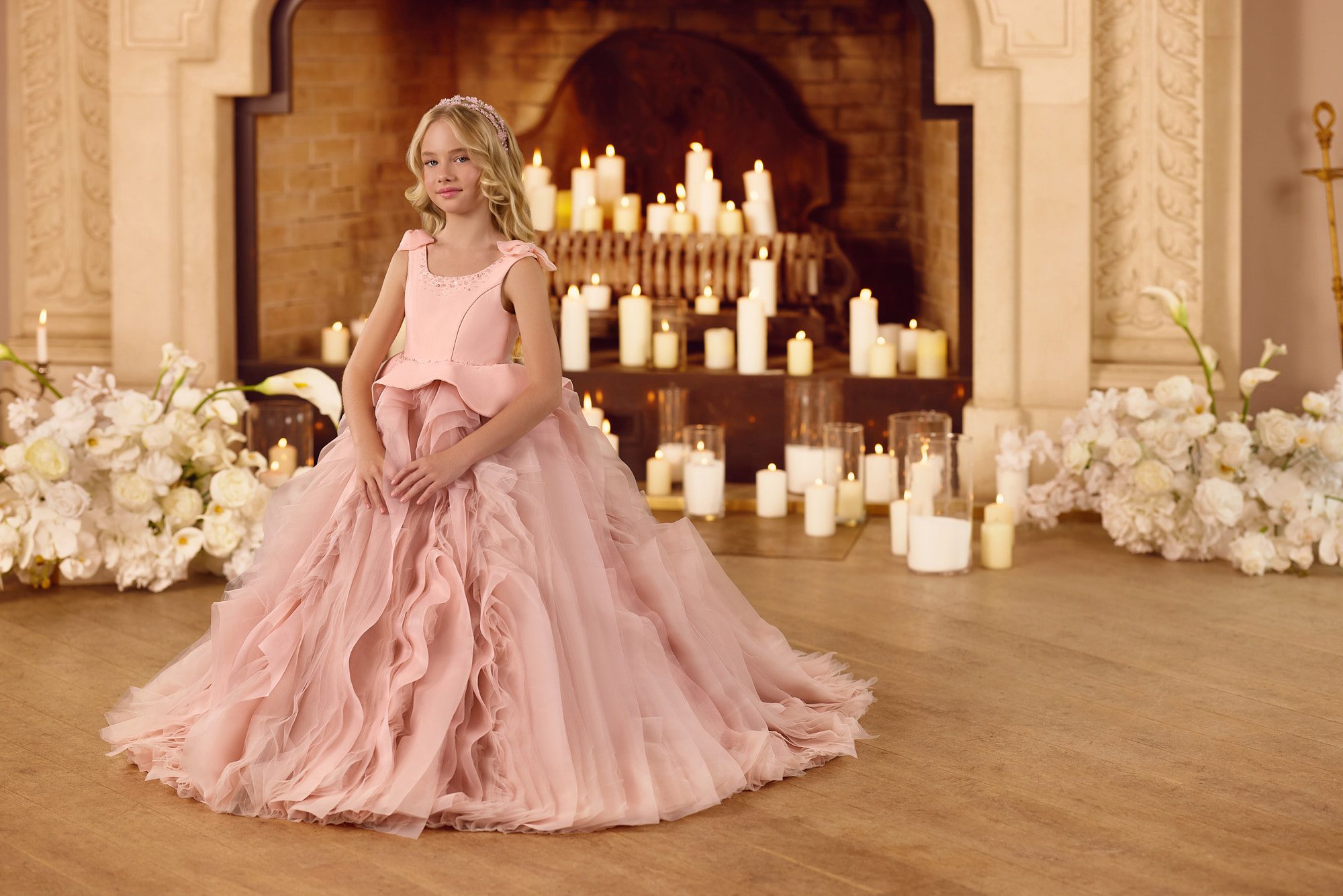 Soft as a sunset and luminous as morning dew, Noora Serenade captures the poetry of celebration. The bodice is gently traced with hand-sewn crystals, each one glimmering like a droplet of light along the graceful sweetheart neckline. Beneath, a sweeping skirt of layered blush-rose tulle falls in billows of soft volume, creating a silhouette worthy of a storybook princess.