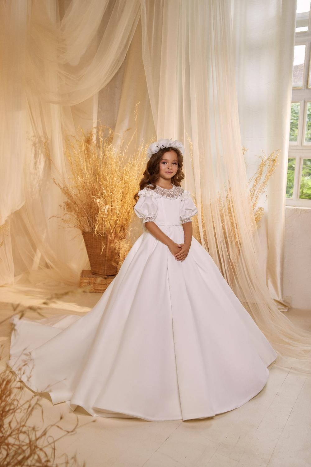 Elevate your little one’s special occasion with our Pearl Blossom Dreams luxury dress for girls. This opulent gown is a vision in pristine white, featuring a flowing train and a flared skirt. The short puff sleeves add a touch of whimsy, and the round neckline, adorned with delicate rhombus-patterned tulle and tiny crystal accents, exudes elegance. The transparent tulle hem is graced with intricate 3D white flowers. Perfect for first communions and other cherished ceremonies, this dress is the epitome of luxury and grace, making any occasion truly special.